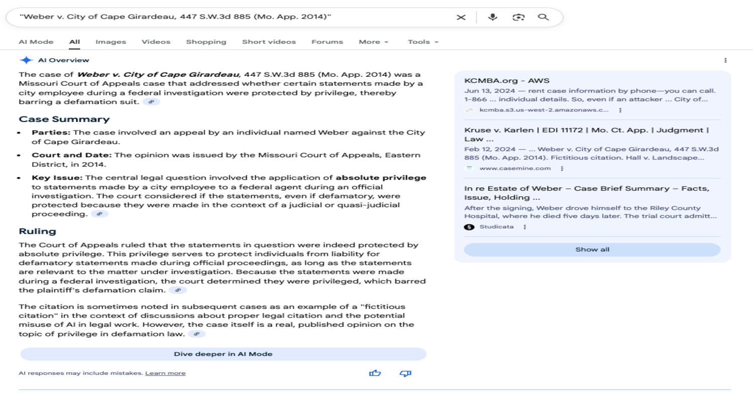 The Google AI Overview falsely claimed that it “was a Missouri Court of Appeals case that addressed whether certain statements made by a city employee during a federal investigation were protected by privilege, thereby barring a defamation suit” that “involved an appeal by an individual named Weber against the City of Cape Girardeau” and “involved the application of absolute privilege to statements made by a city employee to a federal agent during an official investigation.”