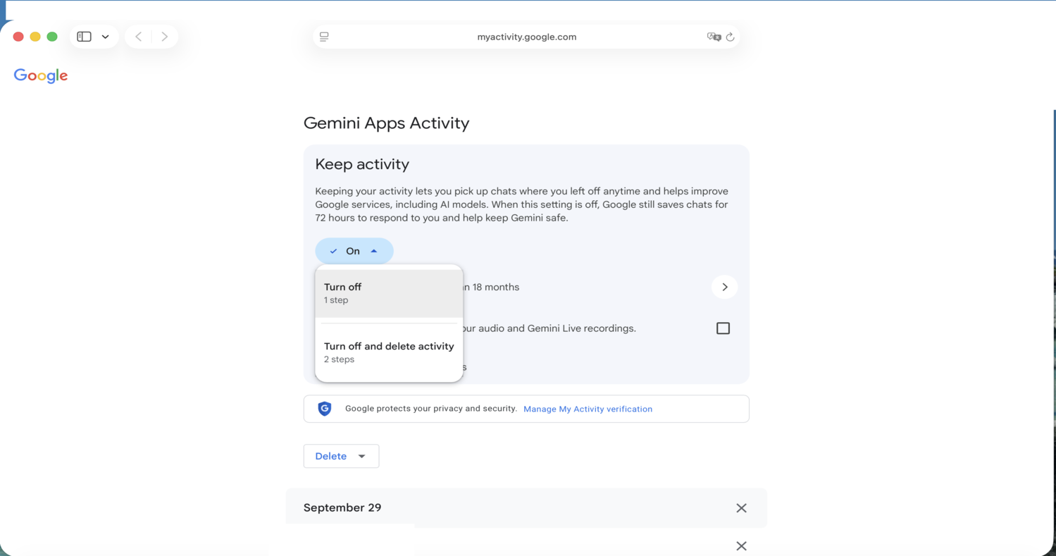 - Configure data retention and auto-deletion, which is necessary to avoid training on your conversations with Gemini. (Euphemistically: “your activity…helps improve Google services, including AI models”).