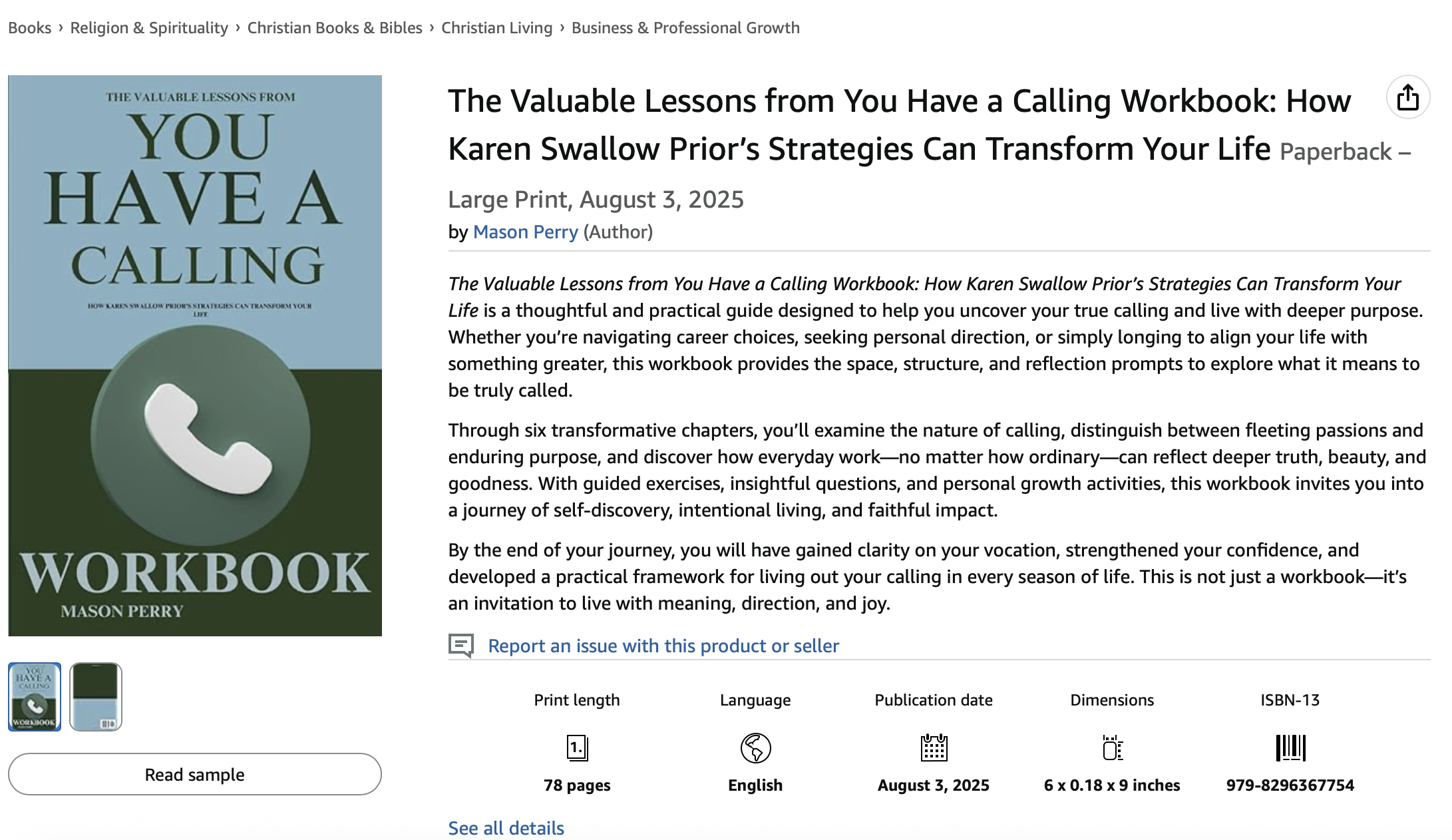 Previously, I had come across this Substack note by Karen Swallow Prior. The note itself was from August 1, 2025, mentioning that a fake AI-generated workbook was being sold on Amazon (by an author called "Joshua Perkins") and was spoofing Prior’s newly released book You Have a Calling. However, I did not see that Substack Note until the Substack algorithm randomly surfaced it for me sometime in mid-August. But out of curiosity, I searched Amazon to see if that fake was still available. It appears to have been taken down by then, but there was another book spoof targeting You Have a Calling and other book spoofs targeting books published by the same publisher.