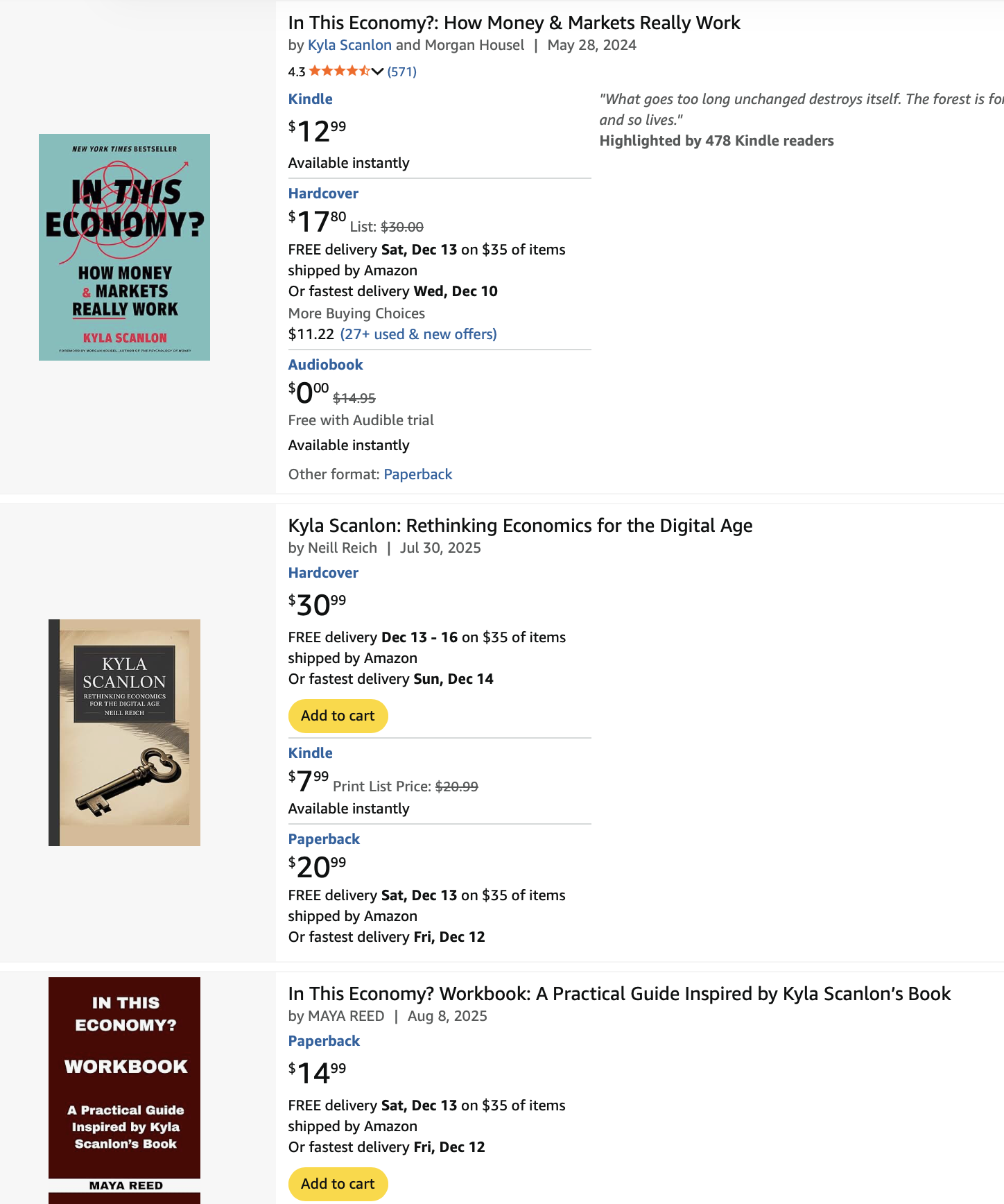 As of October 13, 2025, there were still a large number of so-called “workbooks” and so-called “biographies” referencing Kyla Scanlon or Kyla Scanlon’s book In This Economy? on Amazon. The book spoofs had clearly been churned out at an absurd rate. There were nine (9) groupings of fake author profiles I identified at that time targeting Scanlon and other personalities: