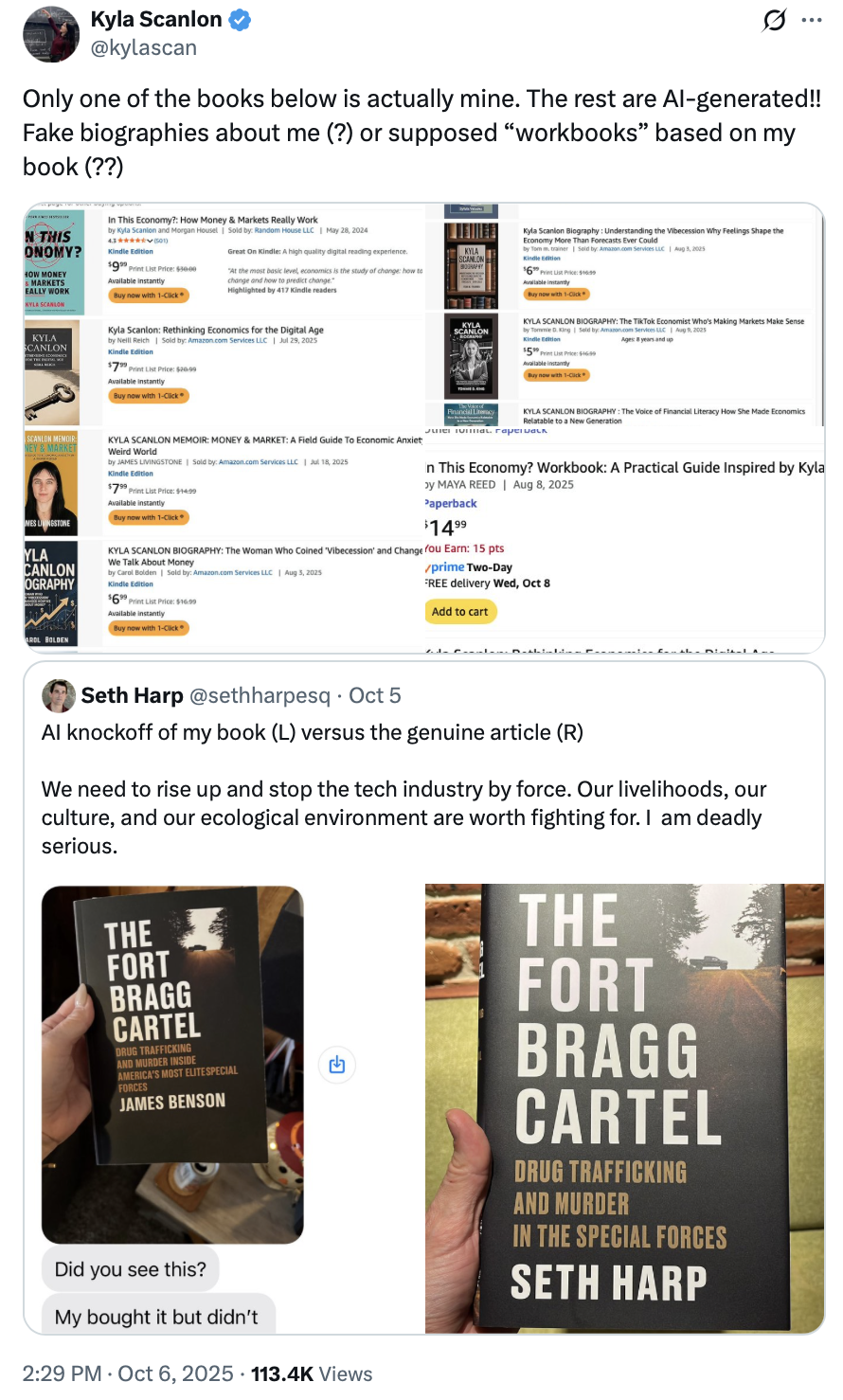 I saw Kyla Scanlon’s X post in early October responding to another author who also noted the same problem of AI so-called “workbooks” and other AI spoofing of the authors on Amazon. As it turns out, Rolling Stone, later published an article about the latter author in late October 2025.