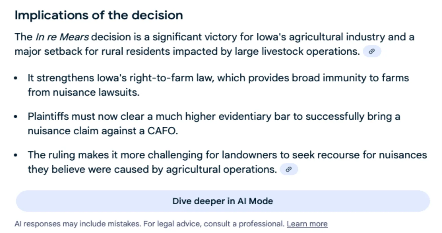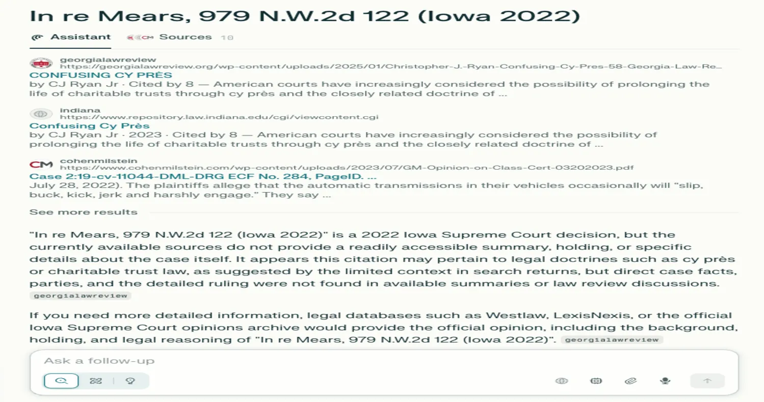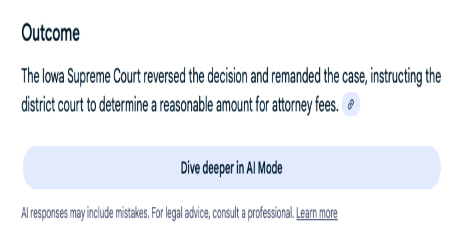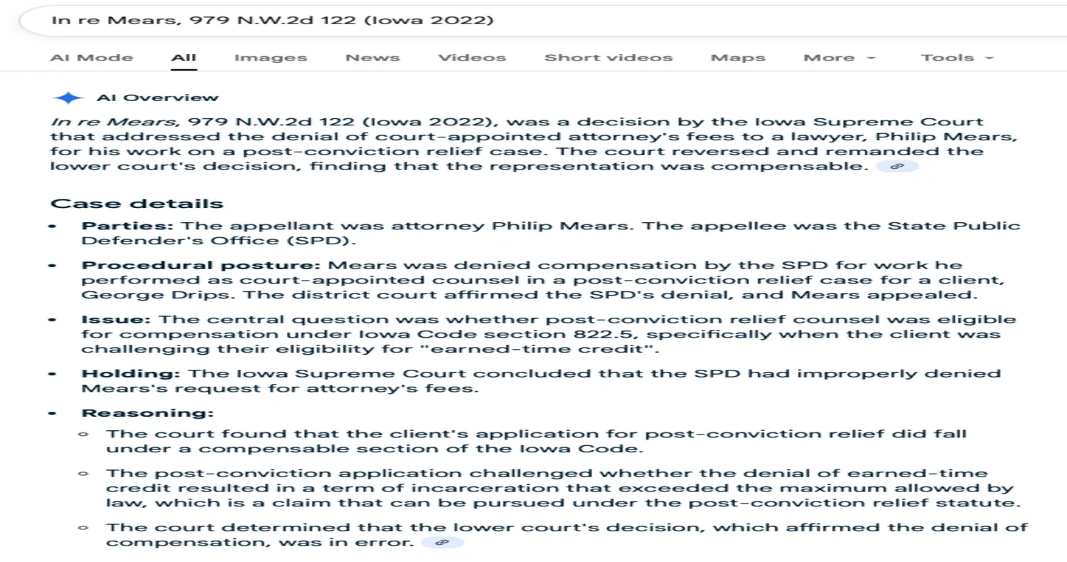 Other AI Mode summaries were not supported by the cited sources, but hallucinated by Google AI Mode itself. In other words, the source of the false information appeared to be Google’s AI itself, not underlying inaccurate sources providing the descriptions of the fake cases.