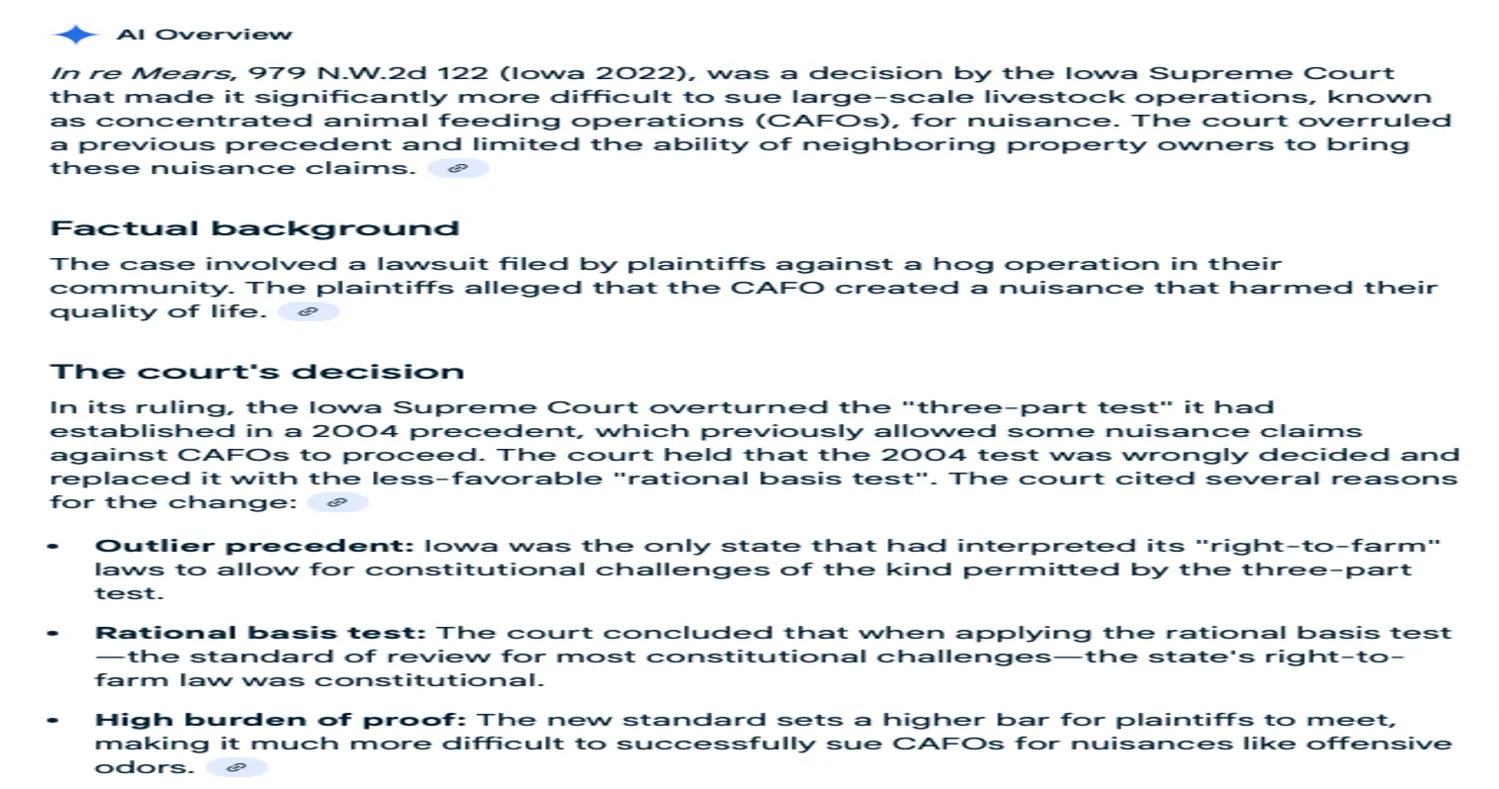 The supposed descriptions of the cases was typically not supported in the cited sources, but hallucinated by Google AI Overview itself. In other words, at least some of the false information appeared to be from Google’s AI itself, not underlying inaccurate sources providing the descriptions of the fake cases.